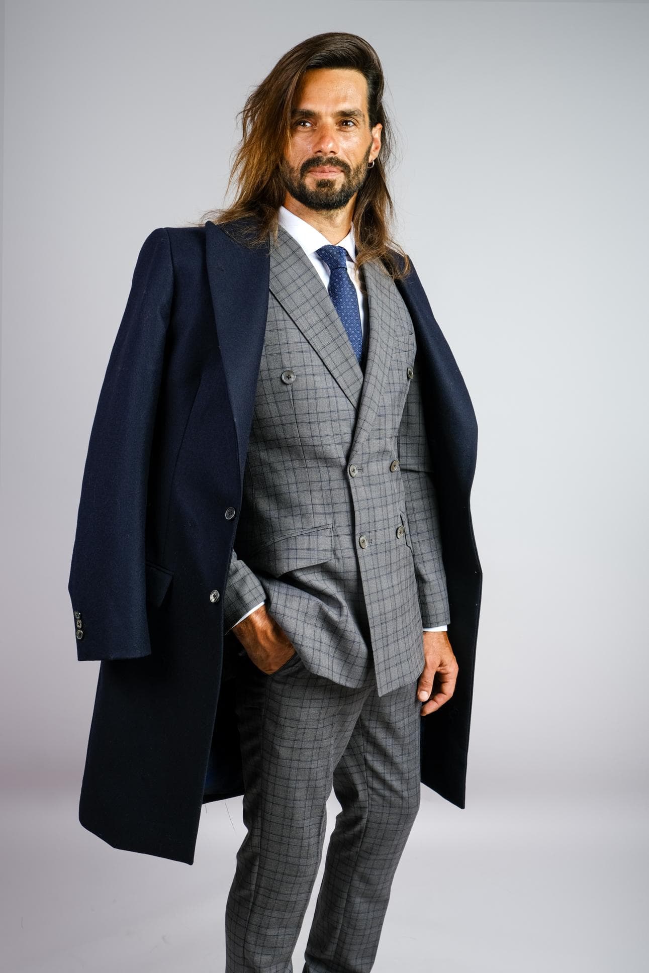 GREY CHECK 3-PIECE SUIT & OVERCOAT