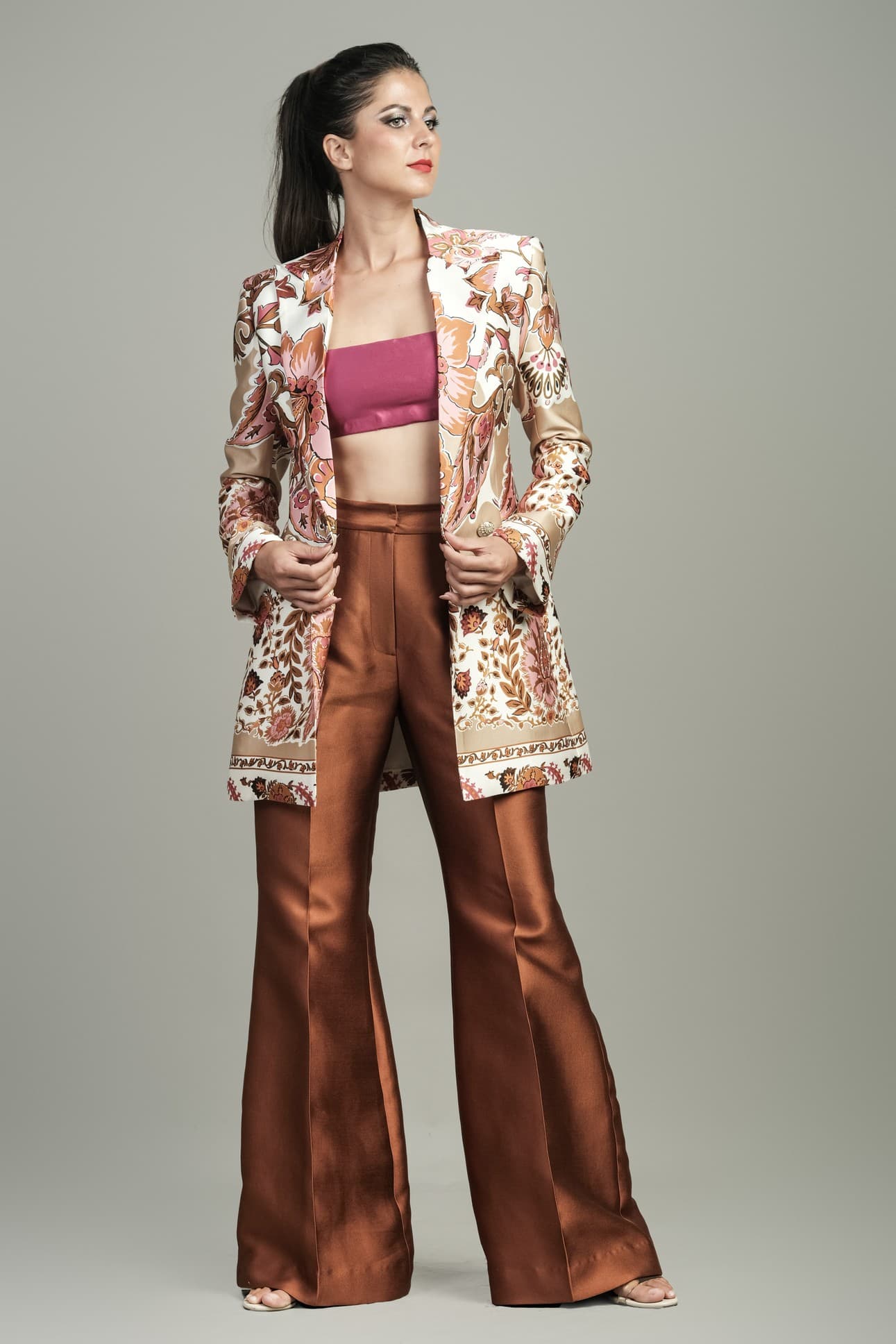 Tailored with a structured silhouette, this longline blazer features intricate borders and a rich floral tapestry in autumnal shades of rose, amber, and sienna. Versatile enough for statement layering or power dressing.