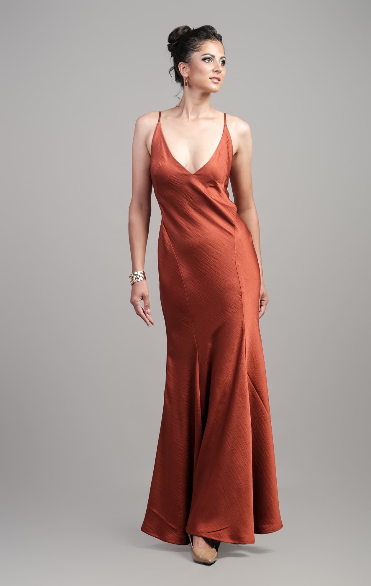 Chiếc đầm 2 dây cổ V khoét sâu trước và sau gợi cảm,với thiết kế tinh tế bằng các đường đứt cong ở eo tôn dáng cùng các đường đứt mảnh xòe mềm mại ở vạt tạo thêm sự uyển chuyển,duyên dáng.Tông màu nâu cam sang trọng trên nền vải lụa satin bóng mượt.